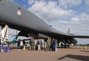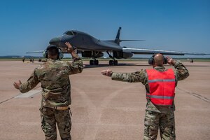 Chief Master Sgt. Steve Cenov, right, 8th Air Force command chief and Joint-Global Strike Operations Center senior enlisted leader, and Airman 1st Class Nicholas DeAnda, 7th Aircraft Maintenance Squadron crew chief, taxi a B-1B Lancer at Dyess Air Force Base, Texas, April 29, 2022. Crew chiefs