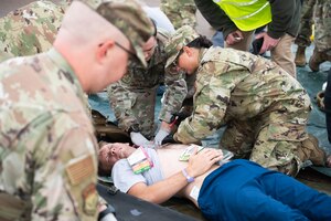 Airman 1st Class Michael Butterfill, center, 341st Civil Engineer Squadron horizontal construction technician, simulates being injured during an exercise Aug. 20, 2021, at Malmstrom Air Force Base, Mont. The 341st Medical Group participated in Project READY EAGLE Aug. 16-20, 2021, which was a