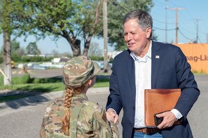 Sen. Steve Daines, right, greets Col. Anita Feugate Opperman, 341st Missile Wing commander, June 3, 2021, at his arrival to Malmstrom Air Force Base, Mont. During his visit to the base, Daines toured a newly completed tactical response force facility as well at the 40th Helicopter Squadron. (U.S.