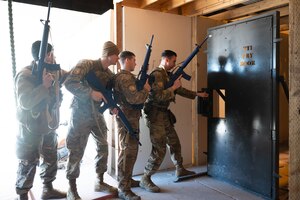 Senior Airman Ryan Gildehaus, right, 341st Civil Engineer Squadron explosive ordinance disposal technician, shows Nicole Nelson, military spouse, how to use an EOD robot during a tour May 7, 2021, at Malmstrom Air Force Base, Mont. During the tour, spouses watched demonstrations, spoke to Airmen