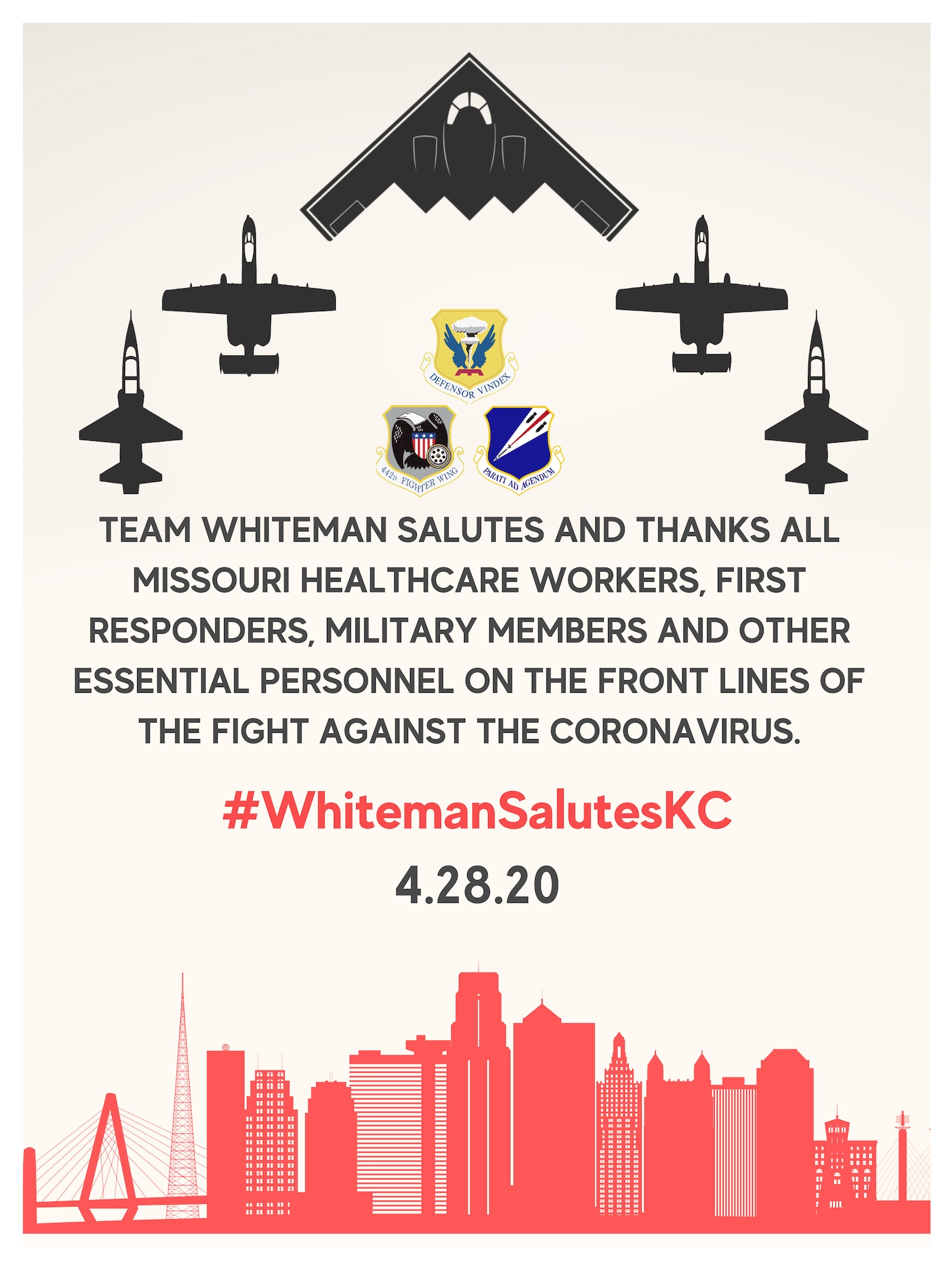 Whiteman Air Force Base pilots are scheduled to fly over medical facilities in Kansas City, Missouri, April 28 to honor and express Team Whiteman’s gratitude for all medical and healthcare professionals, essential employees and volunteers in the fight against COVID-19.