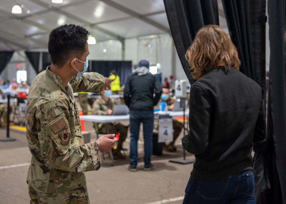Laxamana helps greet and assist local community members at the St. Paul Community Vaccination Center (CVC) in Minnesota.