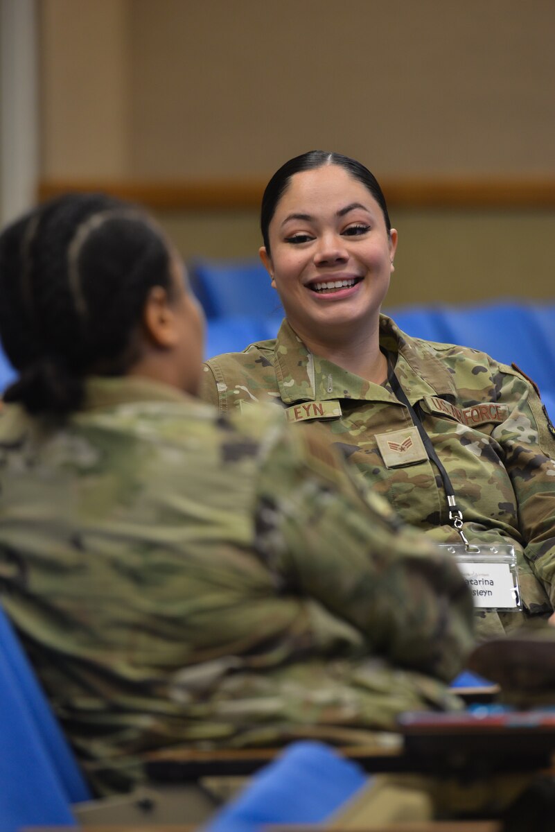 Airman 1st Class Jade Mitchko, 377th Maintenance Squadron Airman, Chief Master Sgt. Joi Washington, 377th Force Support Squadron Airman, and Master Sgt. Latricia Ijato, 58th Operations Support Squadron Airman, discuss topics such as leadership, mentorship and fellowship during the 2022 KAFB Women’s Conference at Kirtland Air Force Base, N.M., June 16, 2022. The conference featured various speakers, a women’s panel, and open discussions. (U.S. Air Force photo By Todd Berenger)