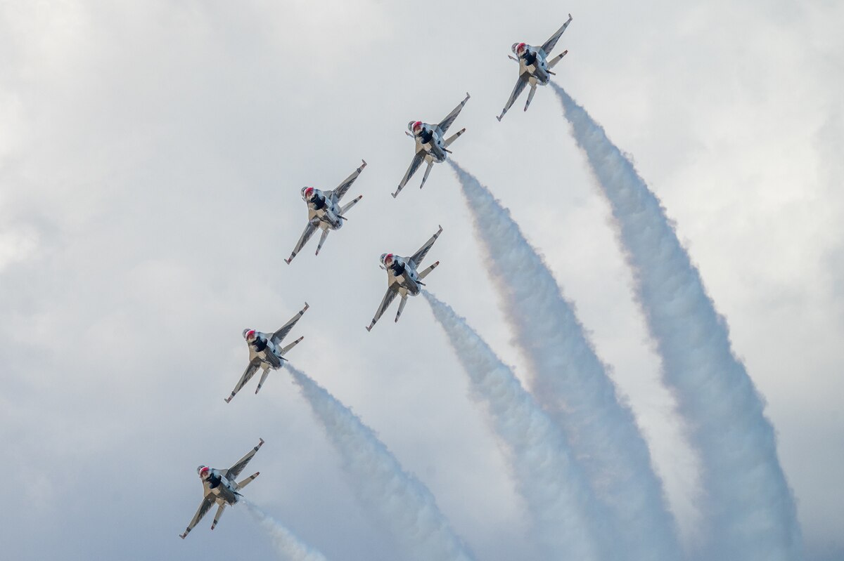 The U.S. Air Force Air Demonstration Squadron "Thunderbirds" pilots perform during Montana's Military Open House "Flight over the Falls" at Montana Air National Guard Base, Great Falls, Montana, July 23, 2022. The Thunderbirds are the U.S. Air Force's premier air demonstration squadron. (U.S. Air Force photo by Airman 1st Class Mary Bowers)