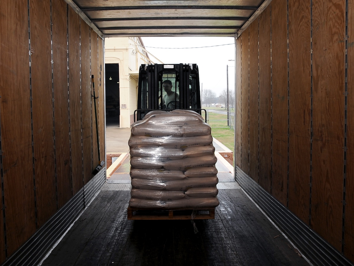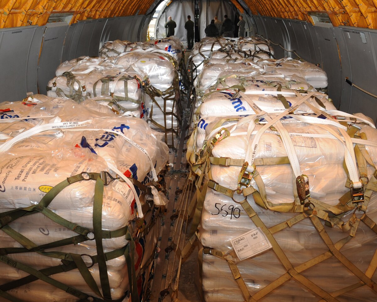 Senior Airman Pierre Brown, 2nd Logistics Readiness Squadron Vehicle Operations, directs Senior Airman Martin Hayes, 2 LRS vehicle ops, as he places an aircraft pallet on the back of a flatbed truck on Barksdale Air Force Base, La., Feb. 5. More than 42,000 pounds of rice was palletized by Airmen from the 2 LRS air terminal operations for transport from the base to Port au Prince, Haiti, in support of Children's Lifeline Foundation. (U.S. Air Force photo/Staff Sgt. Amber Ashcraft)