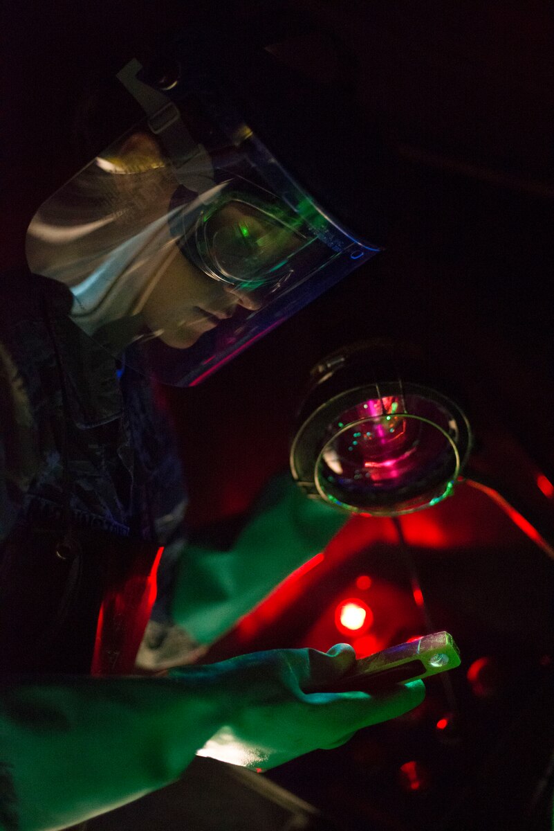 Airman 1st Class Danielle Harrington, 2nd Maintenance Squadron nondestructive inspection apprentice, inspects a part prior to using a magnetic particle machine at Barksdale Air Force Base, La., July 21, 2015. NDI interprets and evaluates aircraft and equipment defects the visual eye can’t see without dismantling the whole component. (U.S. Air Force photo/Senior Airman Jannelle Dickey)