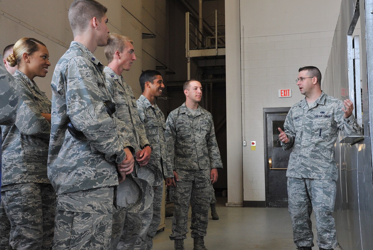 Tech. Sgt. Robert Richards, 341st Maintenance Operations Squadron mechanical and pneudraulics section NCO in charge, left, briefs Air Force Academy and Reserve Officer Training Corps cadets on his section’s role in maintaining Minuteman intercontinental ballistic missiles July 1, 2015. The cadets visited Malmstrom Air Force Base, Mont., as part of Operation Air Force, a summer program where Air Force bases host cadets for approximately two weeks and provide opportunities to engage with active-duty Airmen. (U.S. Air Force photo/John Turner)