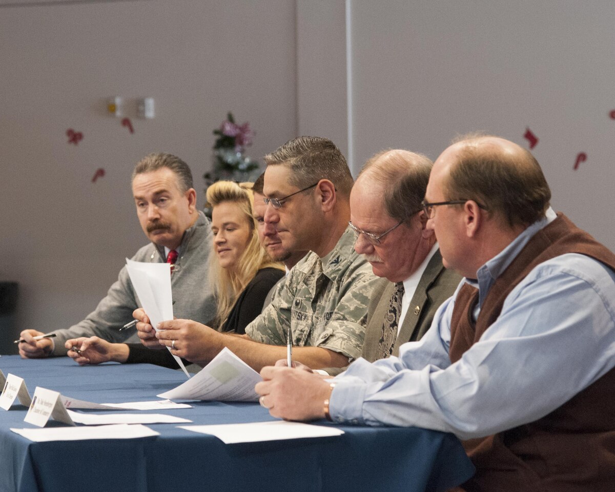 Colonel Stephen Kravitsky , 90th Missile Wing commander; Cheyenne, Wyo., Mayor Rick Kaysen (second from the right); and other members of the F.E. Warren Community Partnership Leadership Committee sign several documents during an Air Force Community Partnership signing event in the Fall Hall Community Center on F.E. Warren Air Force Base, Wyo., Dec. 15, 2015. The committee signed five documents, and more base-community partnership arrangements are in the works. (U.S. Air Force photo by Senior Airman Jason Wiese/Released)