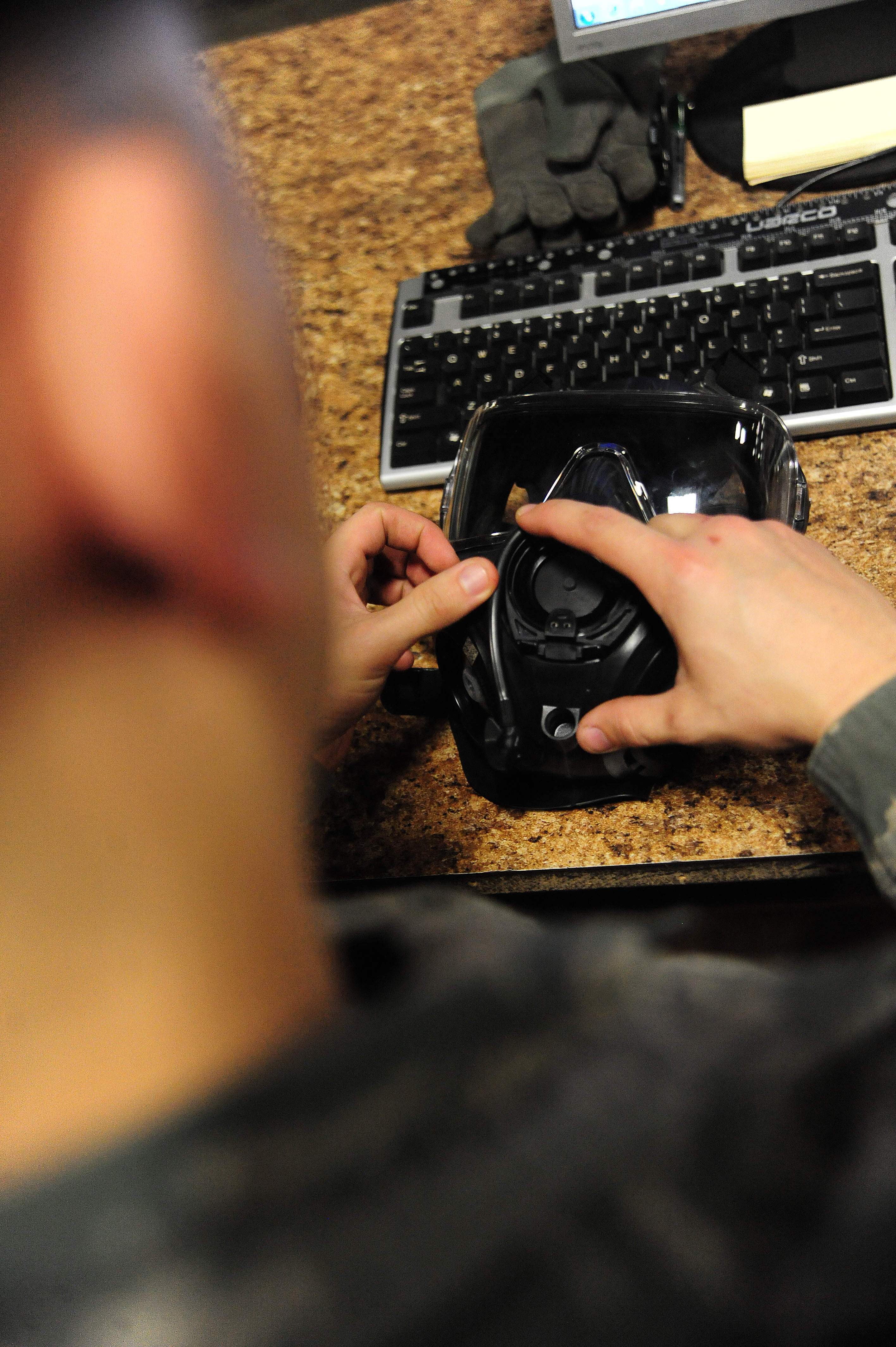 WHITEMAN AIR FORCE BASE, Mo. -- Airman 1st Class Jonathan Merry, 509th Logistics Readiness Squadron individual protective equipment technician, tests the fitting of a gas mask to ensure the valves have a proper seal, Feb. 7. A loose seal could mean the difference between life and death for an Airman under a chemical attack, according to Merry. (U.S. Air Force photo/Staff Sgt. Nick Wilson) (Released)