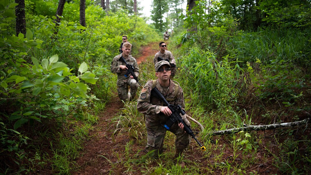 Airmen from the 2nd Civil Engineer Squadron perform individual movement techniques and unidentified explosive ordnance identification during a 2nd CES training exercise at Barksdale Air Force Base, Louisiana, May 20, 2021. Training operational skills such as land navigation, weapons assembly and individual movement techniques, the 2nd CES intensified the readiness of its engineers, allowing the unit to better adapt to changes in the national security environment and compete in the dynamic future of warfighting. (U.S. Air Force photo by Senior Airman Jacob B. Wrightsman)