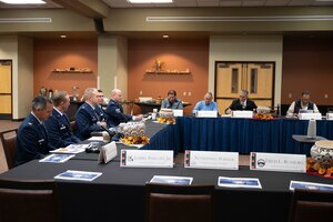 Col. Michael Power, 377th Air Base wing and installation commander, and Chief Master Sgt. Antonio Cooper, 377 ABW command chief, greet Howie Morales, New Mexico Lt. Governor, during his visit to Kirtland Air Force Base, N.M., Nov. 20. During their visit to Kirtland, Morales and the Military Planning