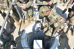 Staff Sgt. Ryan Van Dyke, 341st Security Forces Squadron military working dog handler, agitates K-9 Paul during water aggression bitework training Sept. 7, 2021, at Malmstrom Air Force Base, Mont. The K-9 teams used the base pool to showcase and improve how their partners would react when placed in